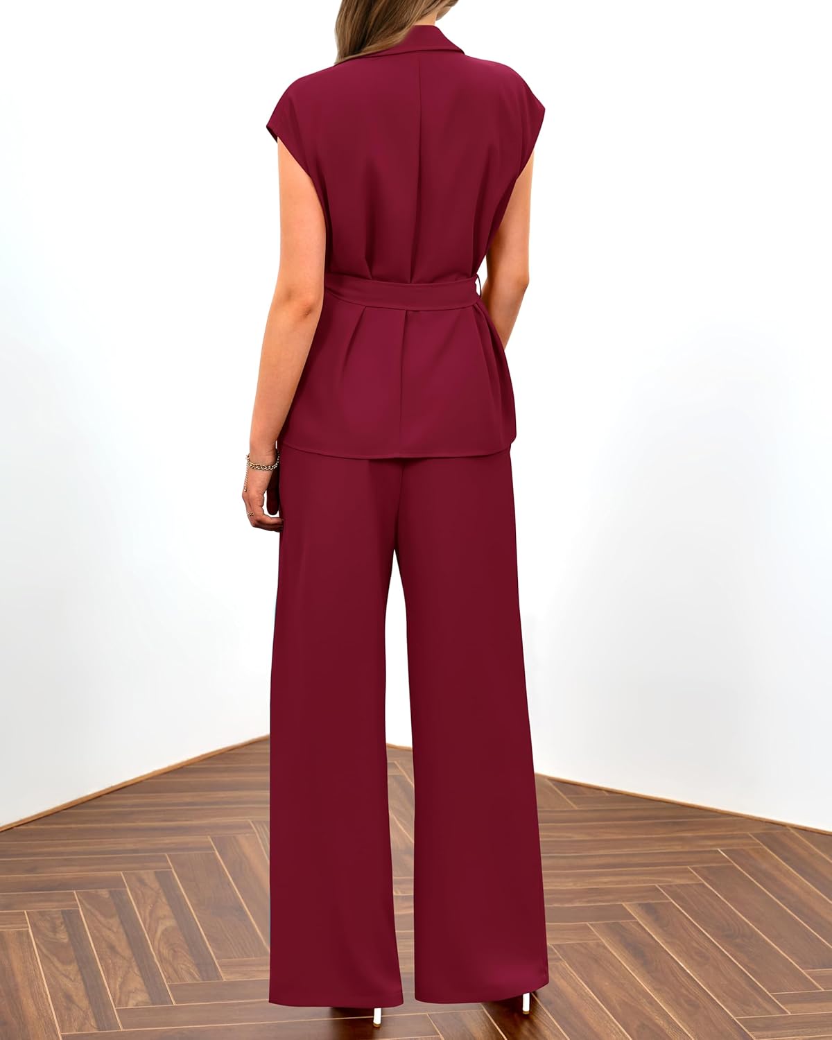 women cap sleeve tie waist vest solid color flowy pant sets holiday vaction 2 piece outifts