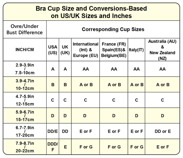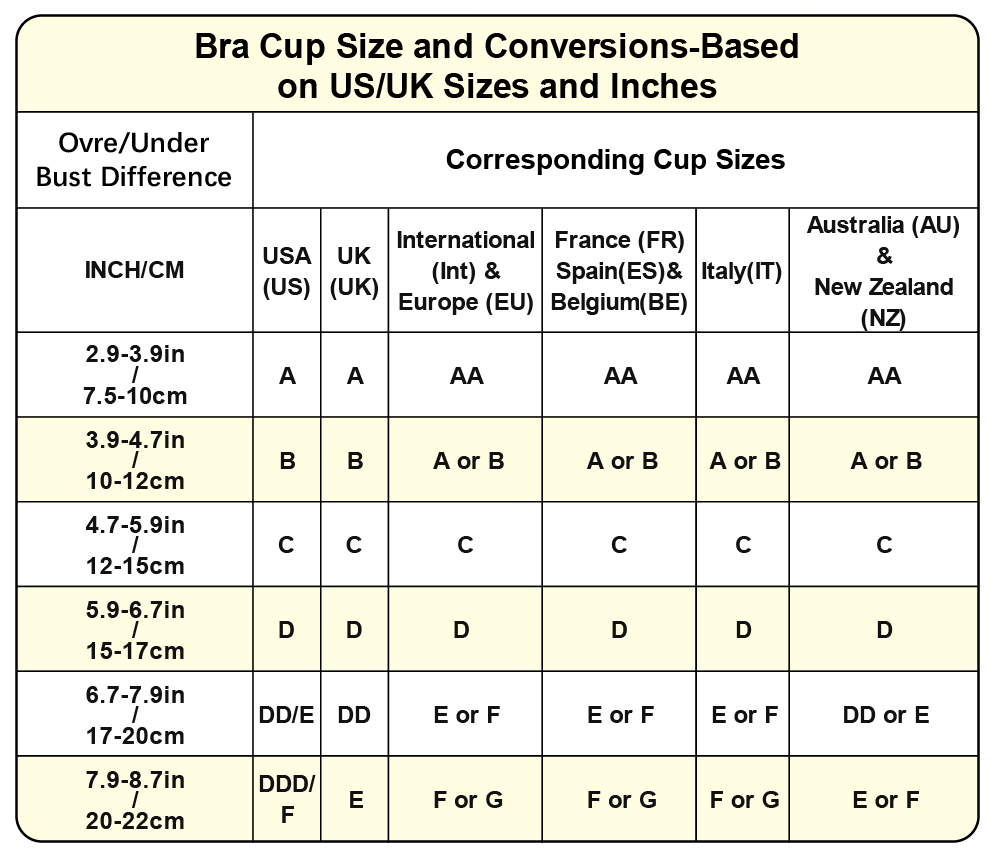 Answer: Step 1,Measure your band size Place the measuring tape around your ribcage, right underneath the band of your bra.Make sure it is pulled tight but is not uncomfortable and that the tape is level.Make a note of how many inches you are.If you land on an even number this is your band size.If you land on an odd number, you’ll want to round up or round down to the nearest even number based on your build. Step 2,Measure your bust size Place the measuring tape around the fullest part of your bust(at nipple level),making sure to hold the measuring tape snugly against you and parallel to the ground. You won’t need to pull the tape particularly tight for this measurement it just needs to sit flat.Make a note of how many inches you are.If it falls on the half-inch, just round up. That’s your bust size! Step 3,Determine Your Cup Size Minus your band size from your cup size and make a note of this value.This difference indicates your cup.Example: 37 inches (bust) – 34 inches (band) = 3 inches. That's a 34C. 0=AA , 1=A, 2=B, 3=C, 4=D, 5=DD(E),6=DDD(F), 7=G