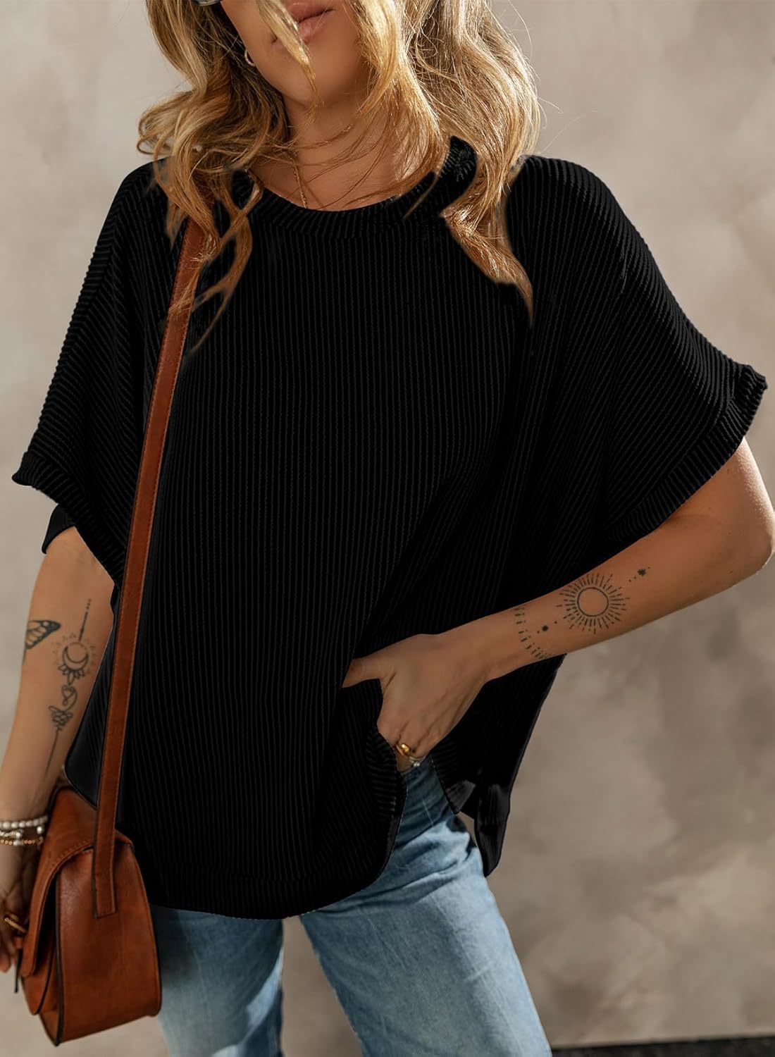 • Feature: Short Sleeve Tops for Women, Solid Color, Crew Neck, Loose Dolman Style Short Sleeves, Basic Tunic Tops, Women Texture Knit T Shirts, Side Slits, Unique Knitting Pattern, Loose Fit Pullover Top.